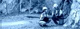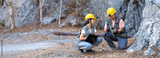 A geologist team is examining rock formations in the field. Geologists Exploring Rock Formations in Nature, Scientific Expedition: Geology and Rock Formation