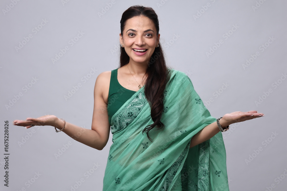 Woman in Green Saree Smiling With Open Palms