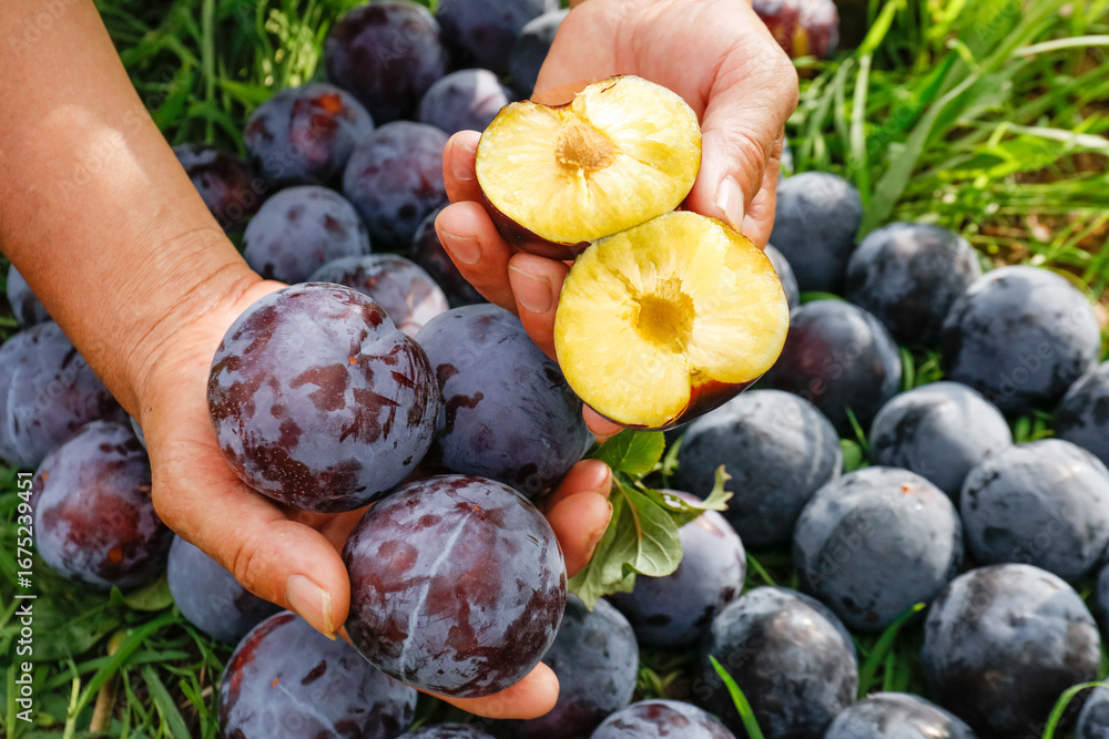 Fresh Black Plums with Yellow Flesh Harvested from Shaanxi Orchard - Ripe Stone Fruit in Hands