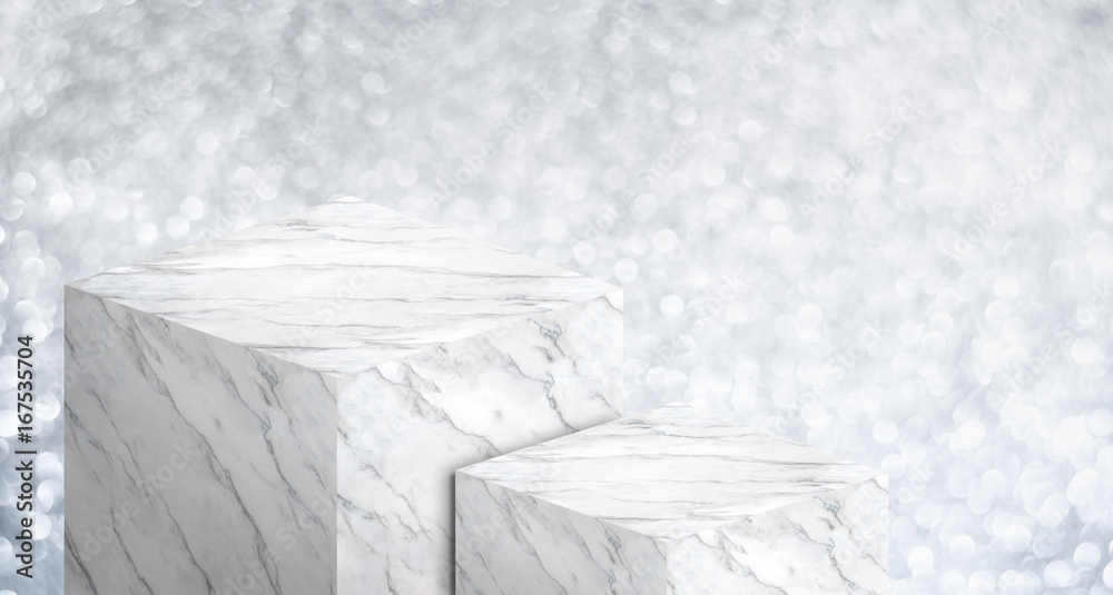 Product display stand made from white glossy marble in two step on silver bokeh sparkle background have copy space for display of content or design,Banner for advertise product on website,3d rendering