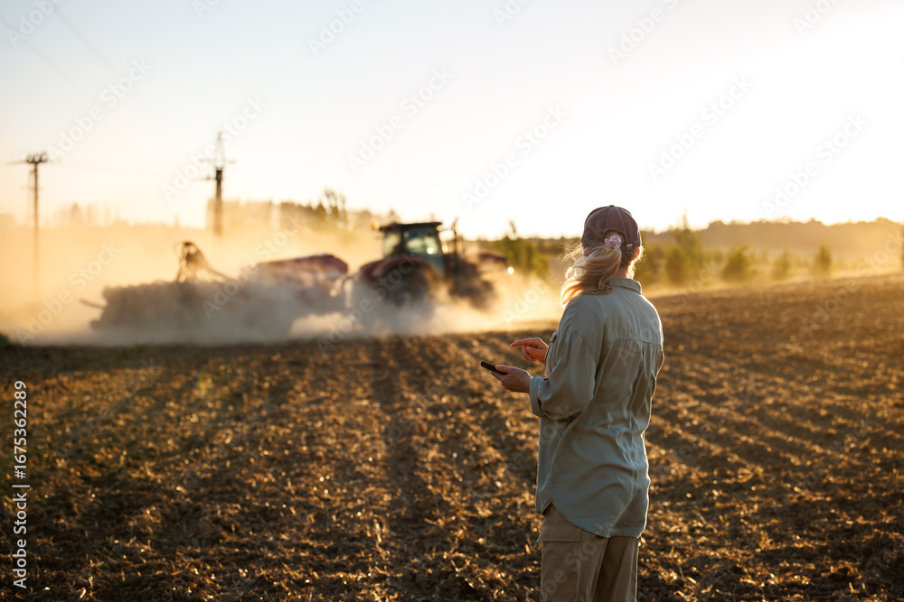 Farmer with smartphone monitoring smart farming cultivation while tractor and seeder prepare soil during agricultural work on field