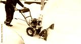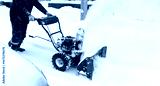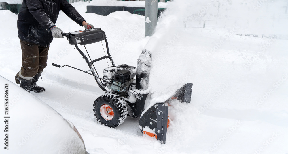 Snow blower removes snow in the yard of the house