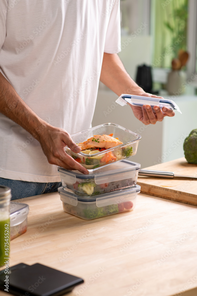 Man preparing healthy homemade meal prep in food container with fresh food at home.