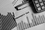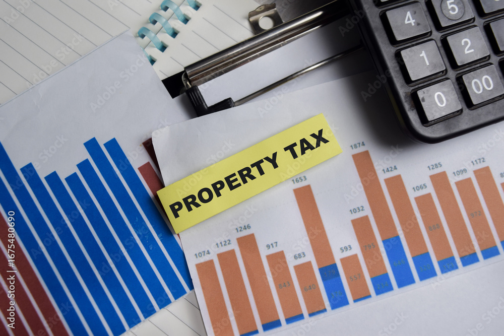 Concept of property tax write on sticky notes isolated on Wooden Table.