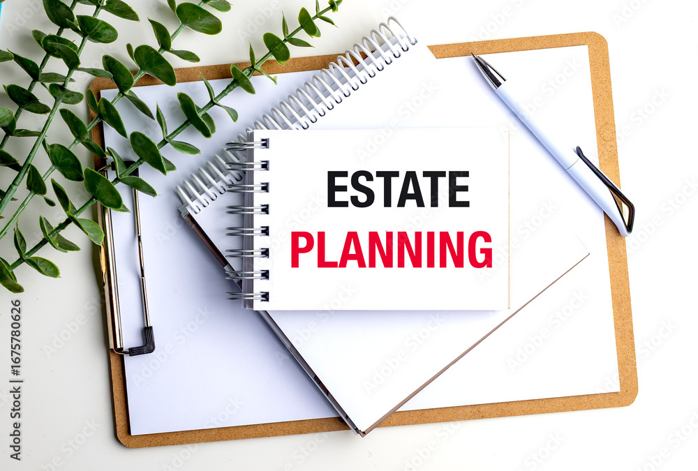 Estate planning phrase on spiral notebook with pen, clipboard and green plant on white background