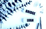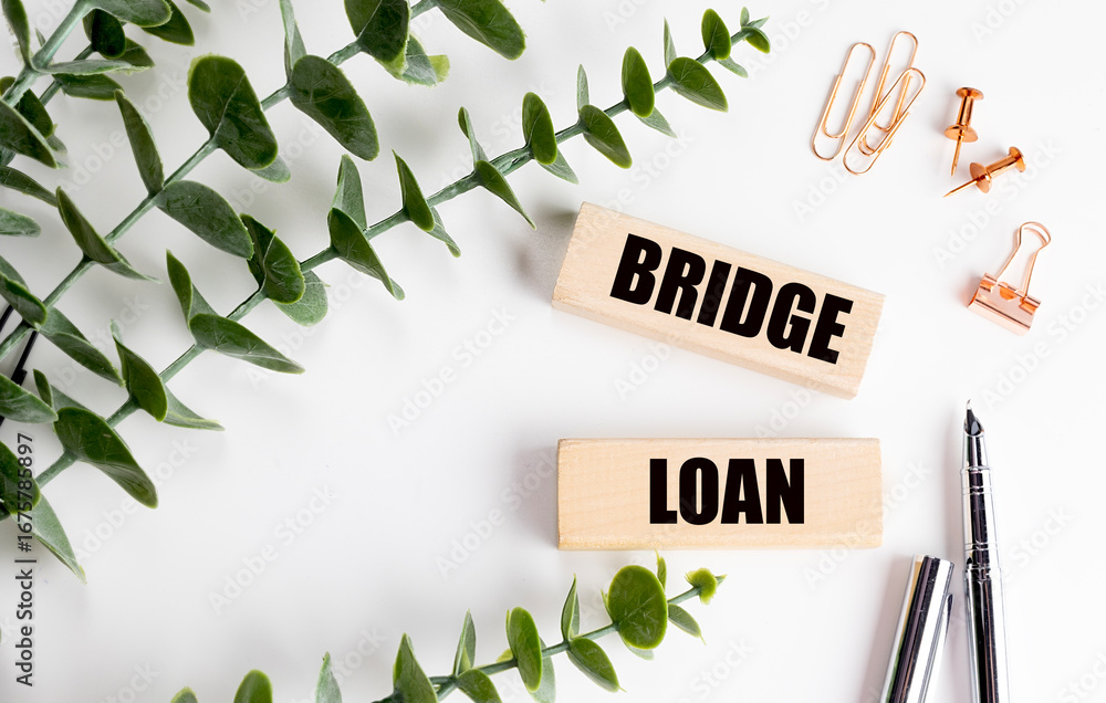Bridge loan concept with wooden blocks, office stationery and green plant on white background
