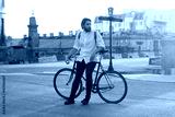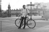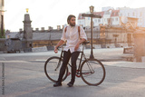 Young man posingwith the bicycle in city, hipster with leather backpack and fixie bike , sunrise background