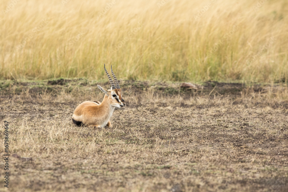 A young Thomson‘s Gazelle, Eudorcas thomsonii, known locally as a Tommie, resting in the grasslands of the Masai Mara, Kenya. A near threatened species in the wild.