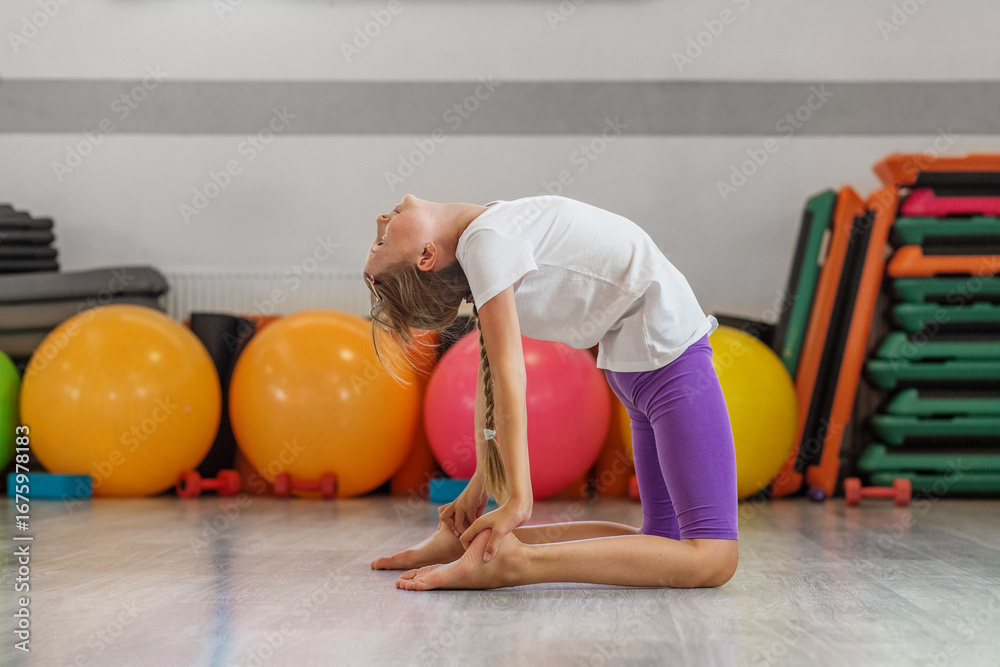 Teen girl doing camel yoga pose in gym