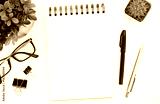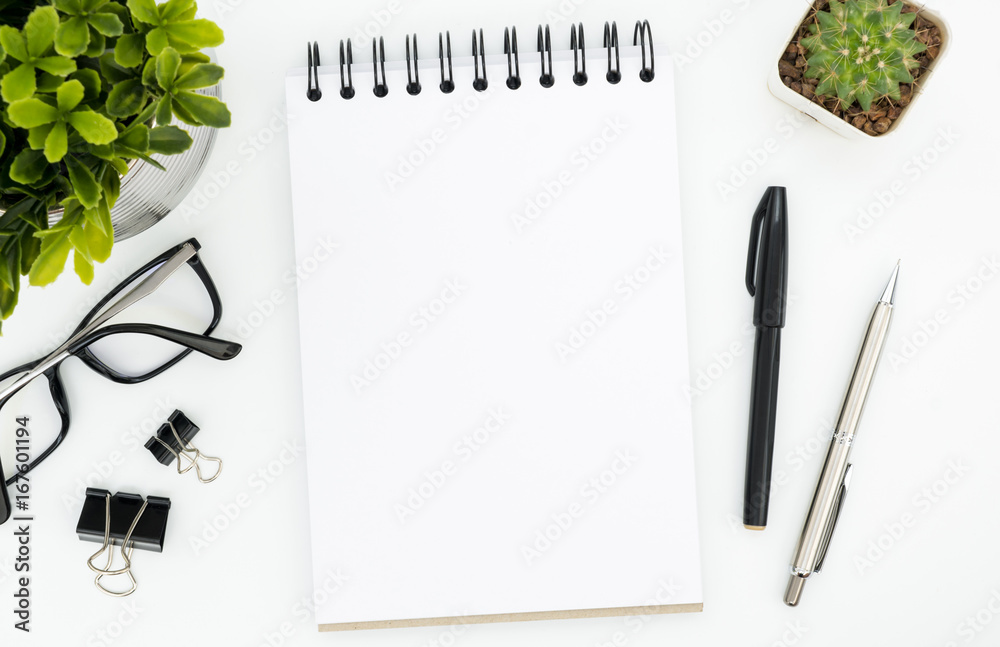 White office desk table with blank notebook page and supplies. Top view, flat lay.