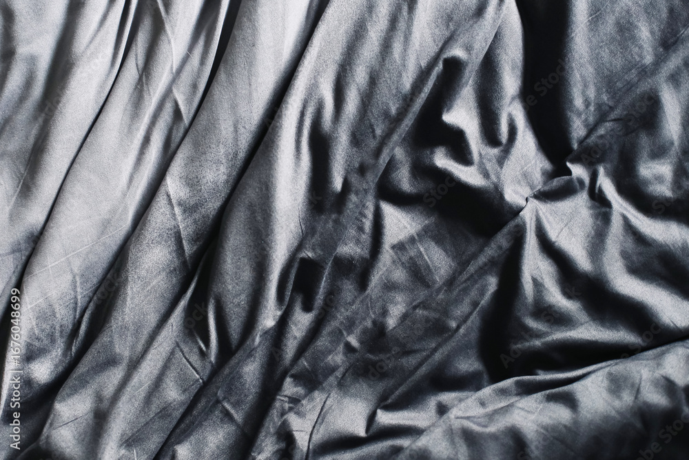 Wrinkled black fabric surface. Closeup of folded textile texture. Dark cloth background with creases. Abstract drapery design. Elegant silk like material. Wavy fabric folds. Minimalist interior detail