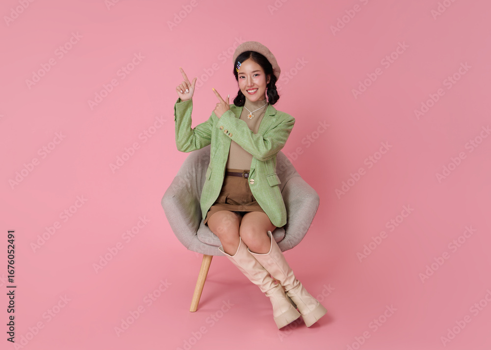 asian woman in green blazer and boots sitting on chair pointing upward with smile, fashionable outfit on pink background representing modern lifestyle confidence creativity and stylish expression