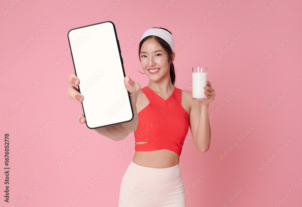 Healthy lifestyle and digital promotion with cheerful Asian woman in sporty outfit holding glass of milk and showing blank smartphone screen for nutrition wellness and fitness app