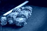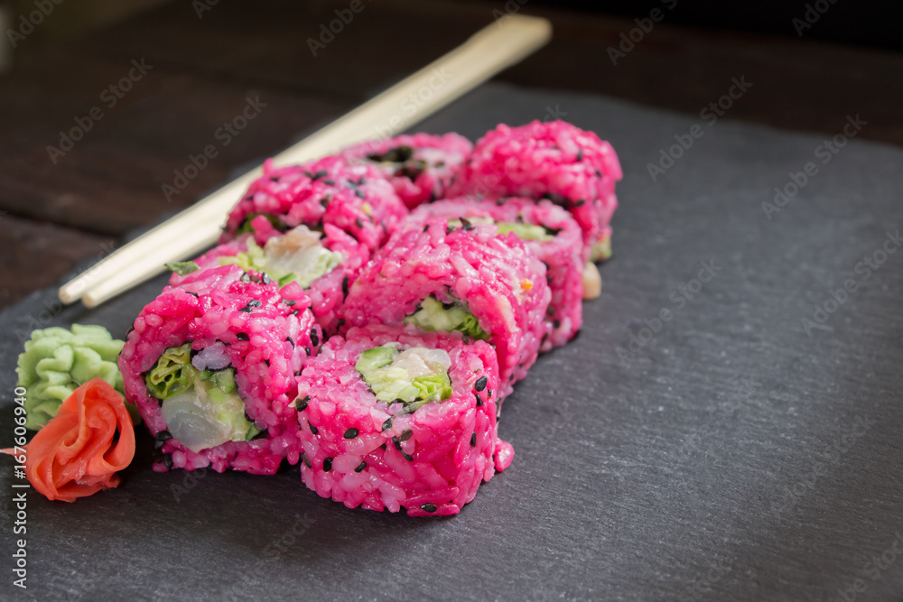 Fresh traditional Japanese sushi with perch, ginger and wasabi served on black stone