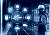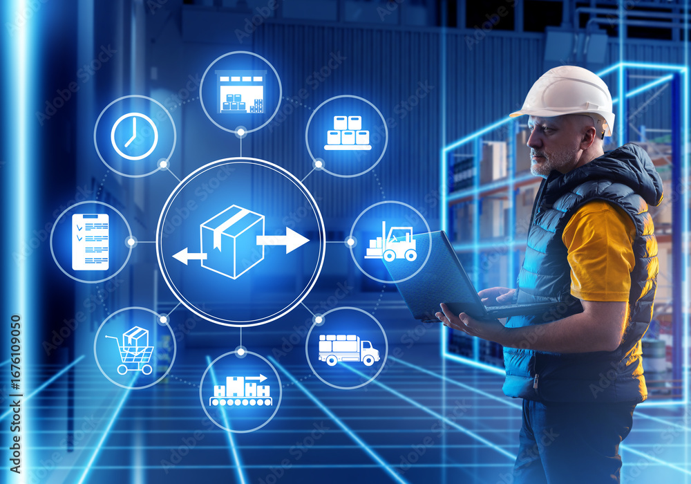 Man manages innovative warehouse. Specialist with laptop near shelves. Manager stands in hangar of order fulfillment center. Man director innovative warehouse. Concept using modern warehouse software