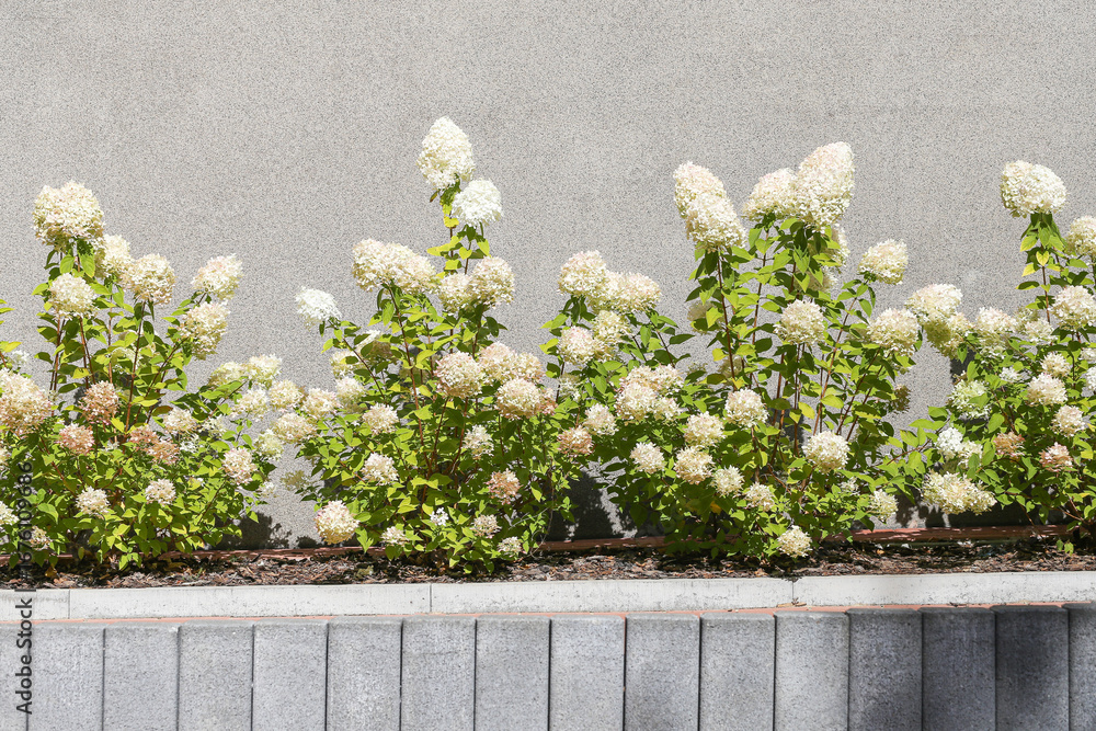 White hydrangea flowers growing by wall. Garden plants in row with green leaves. Blooming bush with summer blossoms. Natural landscaping with ornamental flowers. Bright sunlight and outdoor scenery.