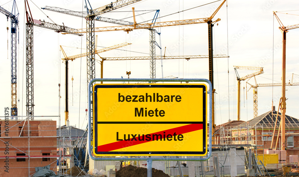 Ein Schild mit dem Aufdruck Luxusmiete vs. Bezahlbare Miete steht als Symbol vor einem Neubaugebiet für Wohnhäuser - FOTOMONTAGE