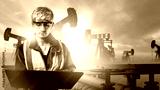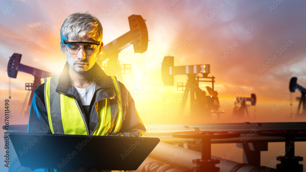Man oilworker at petroleum field. Oil pumps at sunset. Gray-haired oilman with laptop in his hands. Petroleum production. Man oilworker in yellow vest uses computer. Guy makes career in oil industry