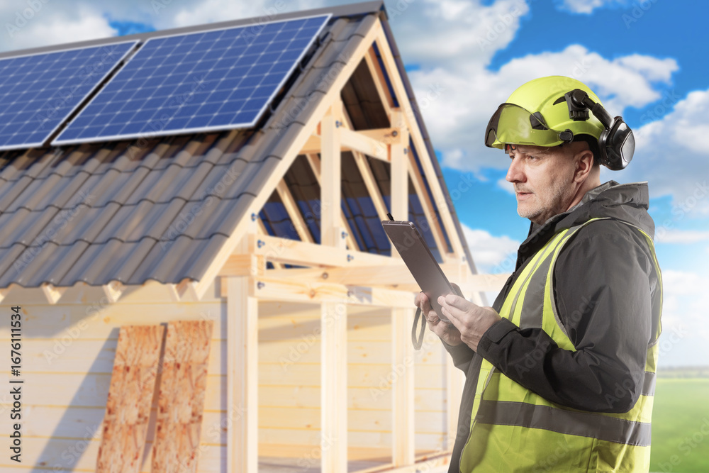 Male builder. Development of energy efficient house. Construction of wooden cottage. Portrait of builder with electronic tablet. Male builder near building with solar panels. Construction of eco house
