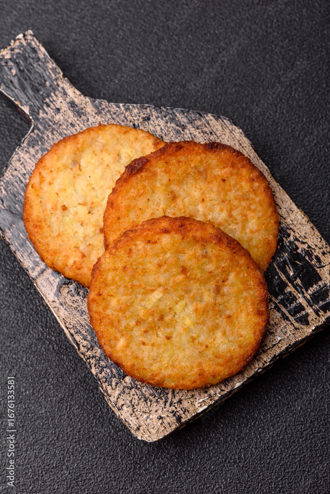 Hash browns, fried potato and onion pancakes with spices for breakfast. Fried hash browns