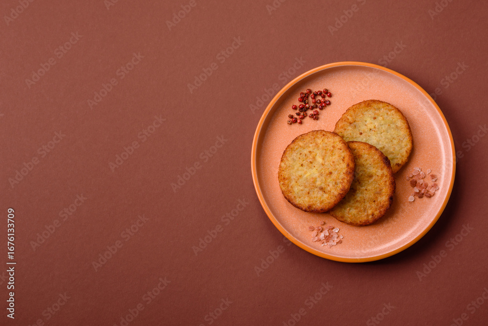 Hash browns, fried potato and onion pancakes with spices for breakfast. Fried hash browns