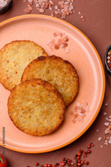 Hash browns, fried potato and onion pancakes with spices for breakfast. Fried hash browns