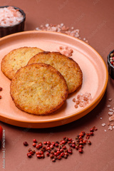 Hash browns, fried potato and onion pancakes with spices for breakfast. Fried hash browns