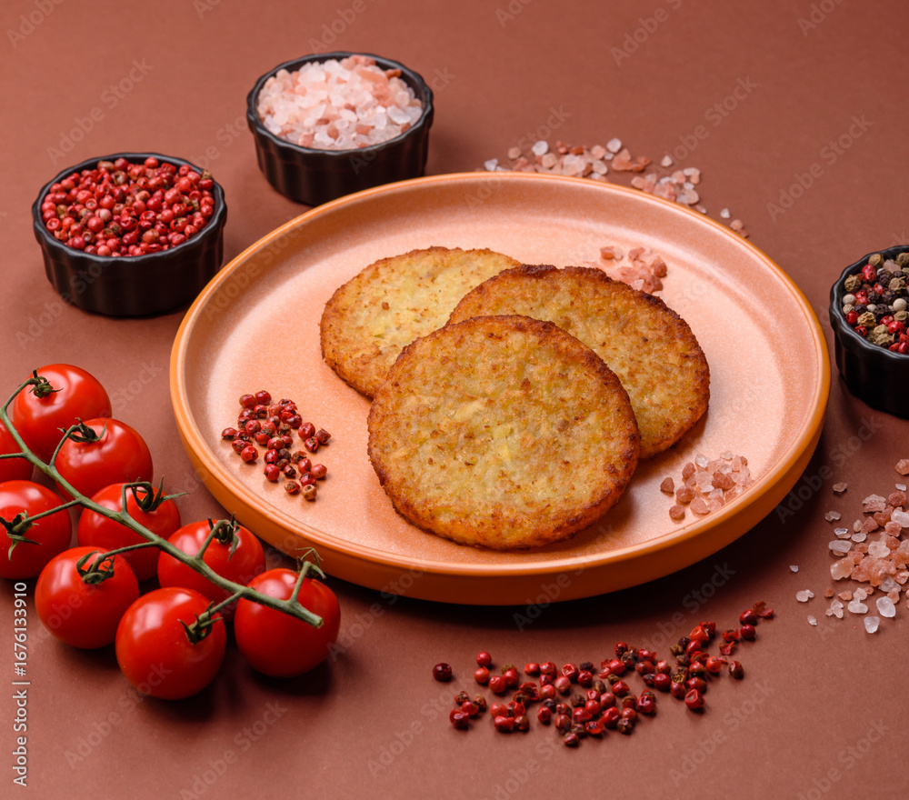 Hash browns, fried potato and onion pancakes with spices for breakfast. Fried hash browns