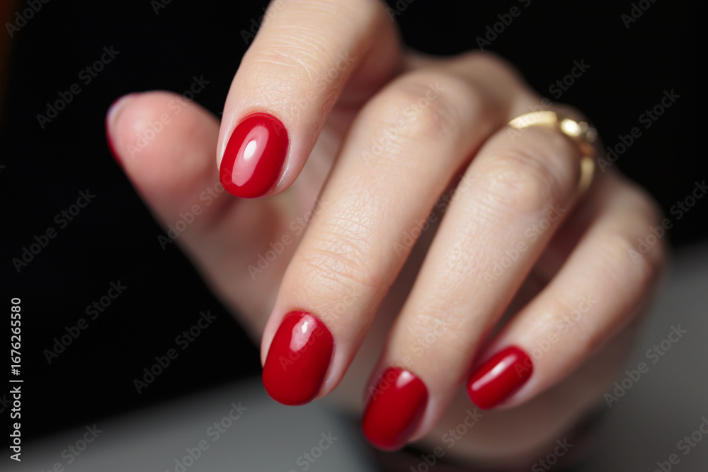 Red manicure with gel polish. Beautiful female nails.