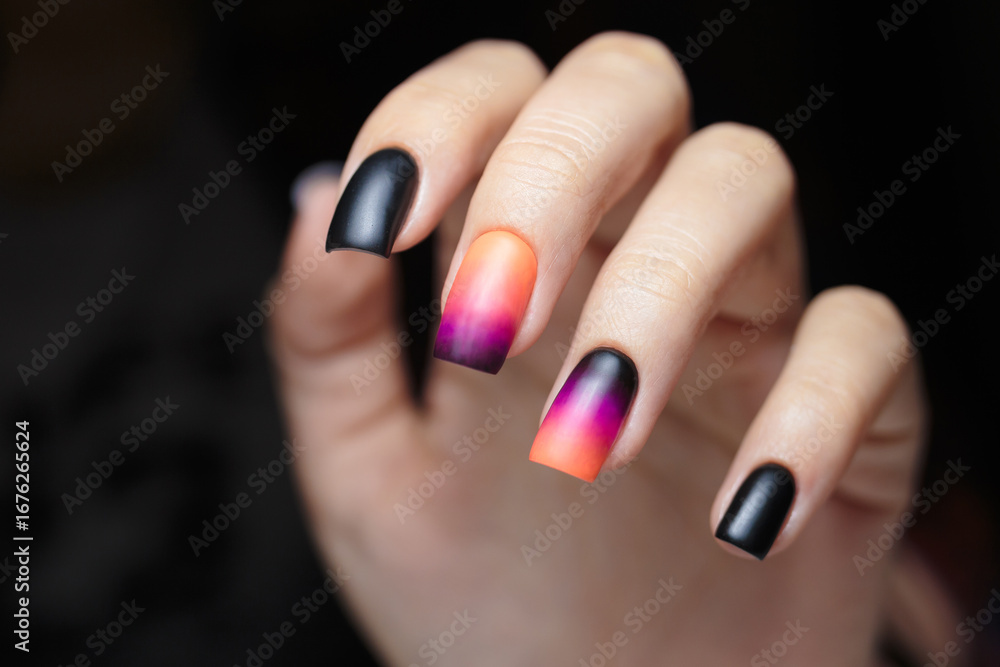 Beautiful red and black manicure, bright nails with gel polish. Nail designs.