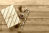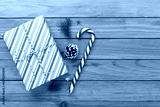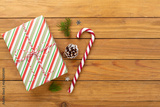 Striped Christmas gift boxes on wooden background, top view
