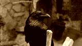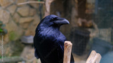 A striking close-up of a common raven, its glossy black feathers shimmering with hints of blue and purple, as it perches on a rustic wooden branch