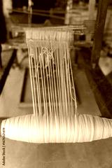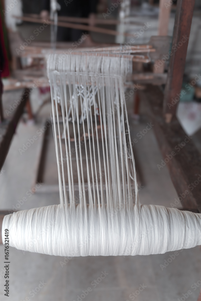 Old traditional wooden spindle with white woollen threads into room of traditional house