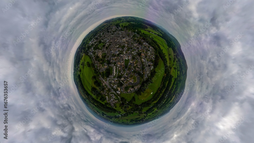 A tiny planet aerial view of Kirby Lonsdale in Cumbria, UK