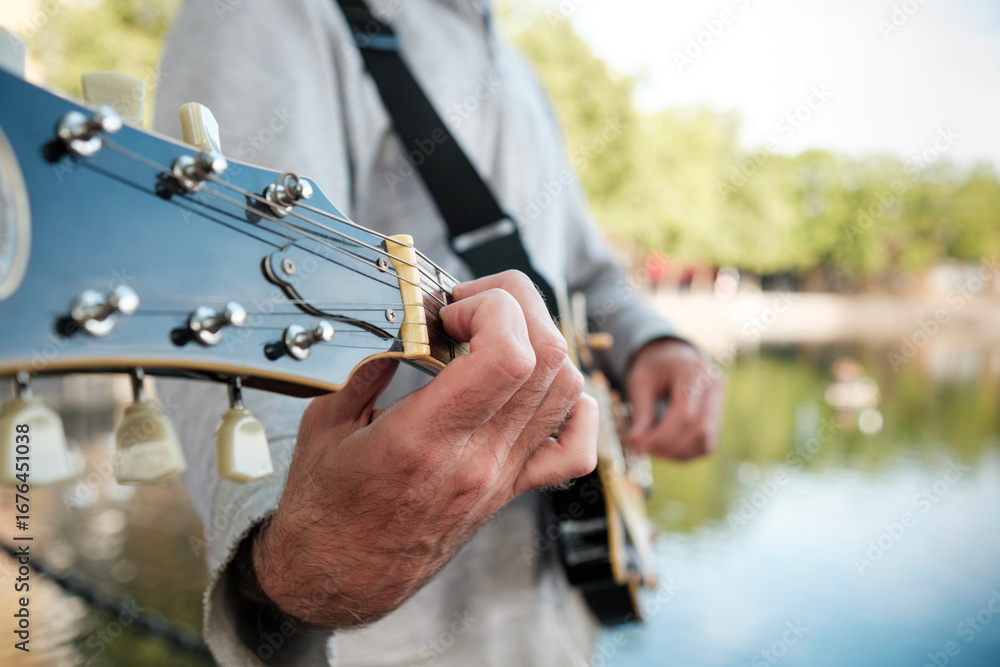 Musician playing electric guitar by the lake on a sunny day