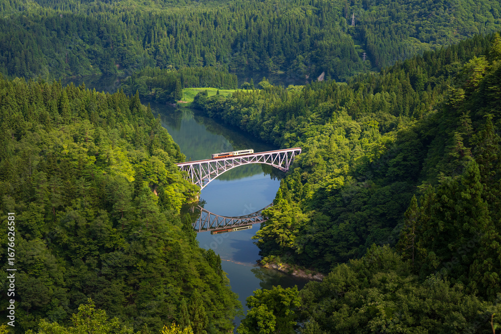 Tadami line train cars crossing the first Tadami-River bridge in Fukushima