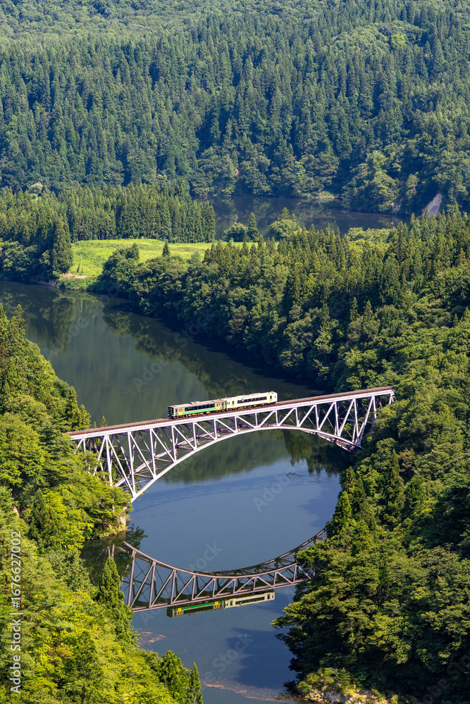 Tadami line train cars crossing the first Tadami-River bridge in Fukushima