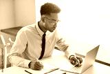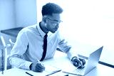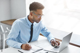 Handsome young dark-skinned manager with stubble wearing eyeglasses and blue shirt with tie having concentrated look while working on presentation using laptop computer, writing down in notebook