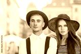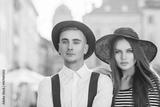 Outdoor close up portrait of young beautiful fashionable couple. Man and woman posing in street. Models wearing stylish clothes and accessories. Sunny day light. Fashion concept. Copy, empty space