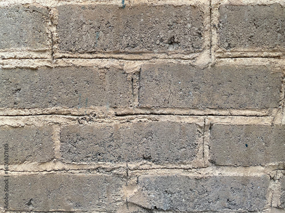 Close-up of an old brick wall with rough cement texture. Weathered masonry background in neutral tones, ideal for construction, architecture, grunge design, or urban industrial style concepts.