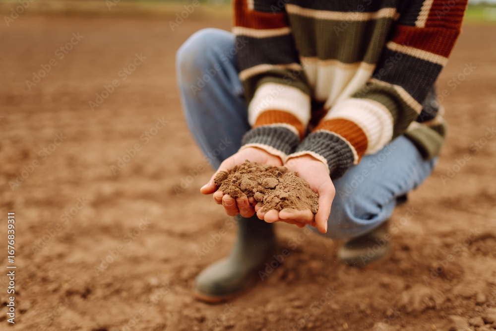 Close up of agronomist holding black soil and pouring it on agricultural field. Young female farmer checking soil quality by touching it with her hands. Agriculture concept. Farming.