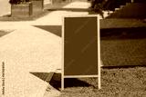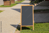 Wooden advertising chalkboard sign on green grass near stone pavement. Empty blank blackboard with wooden frame for cafe restaurant or shop message. Outdoor street view with space for text and design.