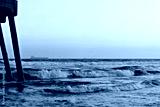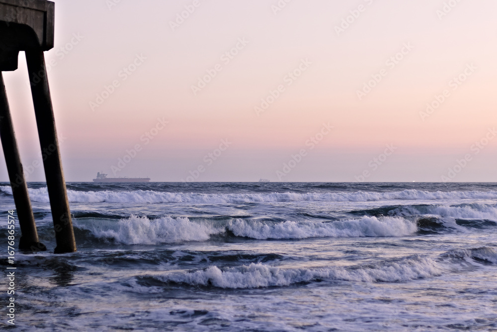 Gentle waves roll toward shore beneath a pastel sunset sky, with a cargo ship visible on the horizon, creating a serene and atmospheric seascape.