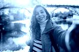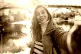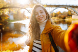 Happy woman stands on the river bank in autumn with a phone in her hands. A tourist blogs and takes selfies while walking through the sunset forest near the water. Weekend concept, blogger.