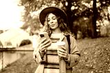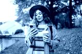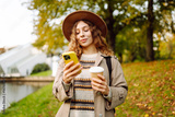 Portrait of a young woman in a hat holding a cup of hot drink and a phone while walking in an autumn park. Cheerful tourist blogging, drinking coffee and enjoying a sunny day. Lifestyle.
