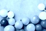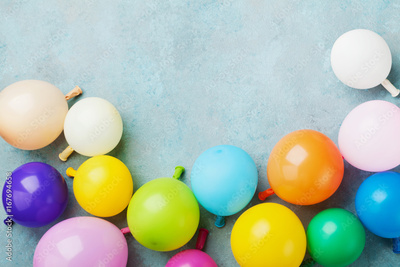 Colorful balloons on vintage blue table top view. Birthday or party background. Flat lay style. Copy space for text.