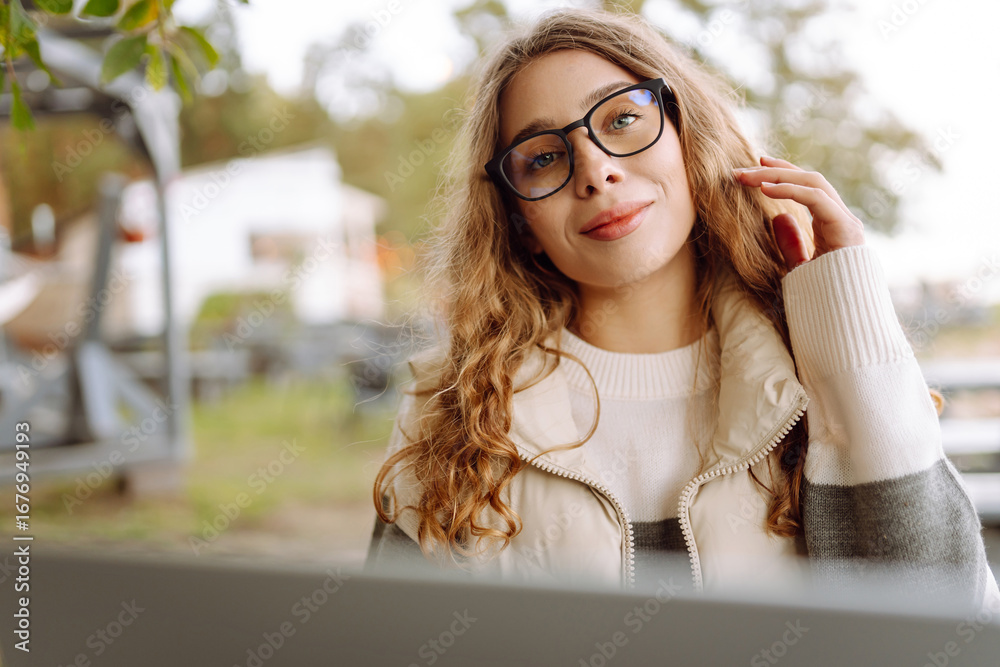 Portrait of a young woman in glasses sitting at a wooden table with a laptop in an autumn park. Nice female freelancer enjoying fresh air and working with a laptop. Remote work concept, weekend.