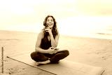 Smiling woman in sportswear with phone and wireless headphones sitting on yoga mat on beach. Young woman enjoying listening to music and seascape after workout. Nature, technology concept.