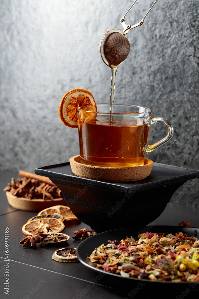 Cup of herbal tea with ingredients and slices of dried orange slices.