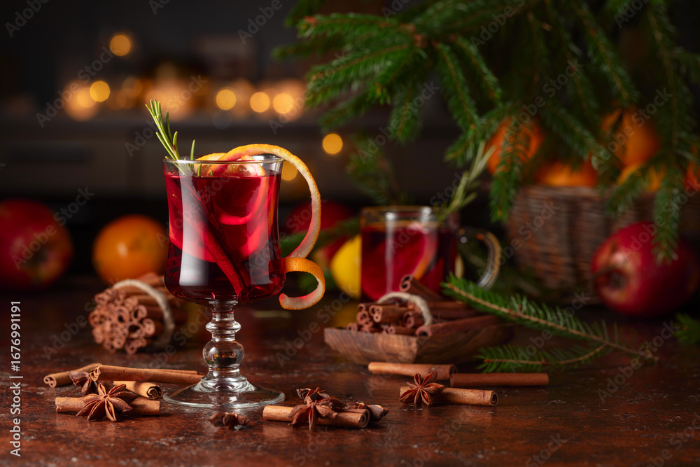 Christmas mulled wine with citrus, apples, cinnamon, anise, and rosemary.